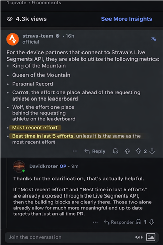 This aligns with what many of us have noticed over the years; Live Segments lose a lot of training value when only an all-time PR or KOM is available.