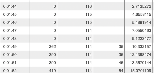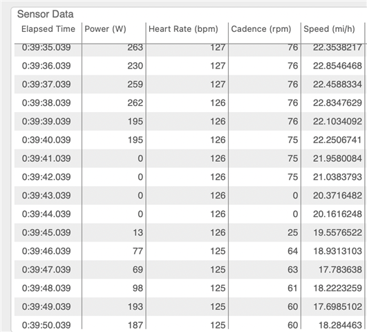 Chart here is just an example. Columns are time/watts/heart rate/cadence/speed