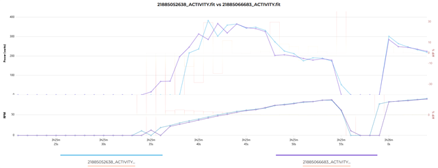 below 30rpm the NG is not showing power just cad for 5-6secs apprx (1sec offset issue between power and cad), the Assioma is immediately. probably the Quarq is not showing both below a threshold cadence value