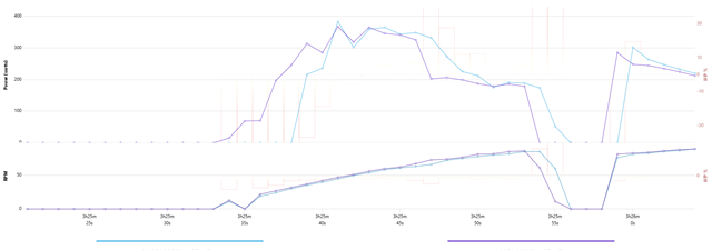 • i searched a data from my yesterday ride (started with 50-11 from 0kmh), ok, it is a better Power2Max NG and not a Quarq, but spider-based and that is showing watts later also than the Assioma Pro RS2, look the graph: (purple Assioma PRO RS2, lightblue NG)