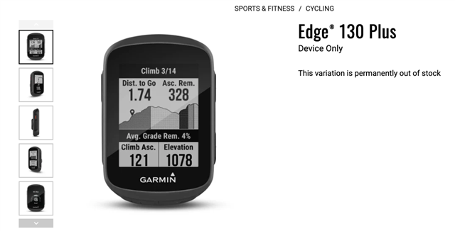 Was looking at REI to replace my Edge 130 Plus (after five years of daily use), and noticed they no longer carry it. Garmin’s site states “permanently out of stock”, so it looks like the Edge 130 Plus has been discontinued. It is still available on Amazon and other sites, so get one now if you like the small size and B&W screen. Haven’t heard about Garmin introducing a similar-size model, or if they expect users to now get the larger Edge 540 model, which has maps and a color screen.