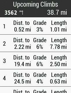 Love the Climbs feature when I load a course. It tells me when it starts, the AVG Grade and the length. Even better, if I click on it, a clear grade profile appears. Brilliant!!