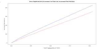 This explains the power difference. The Edge records one second power. It also records accumulated power as transmitted by the power meter. If data is lost due to a low RX rate then the sum of the 1 seconds values does not match the accumulated power values.