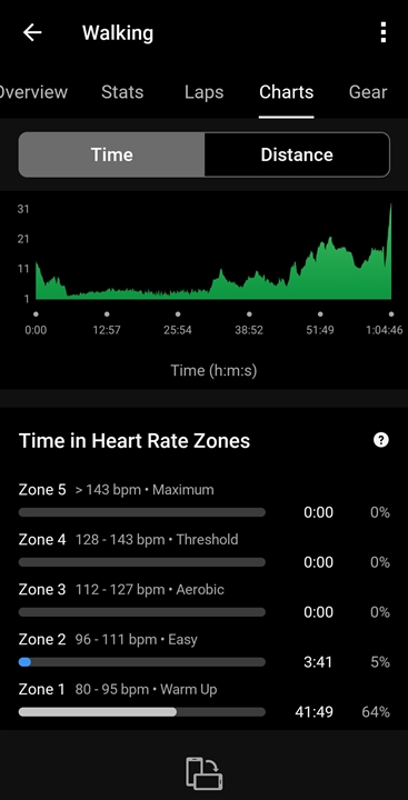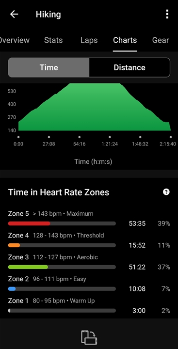 The activity heart rate record is as follows zone 5 - 53min 35sec