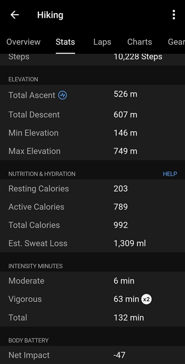 Intensity minutes - yesterday I climbed a 500m it took just over 2h 15m and Im unsure why I only scored 132 minutes, 63min vigorous x 2 and 6 min moderate.