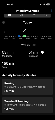 - Activity Minutes is correctly recorded after activity is completed, which moved the graph line to ~100 intensity minutes for the day