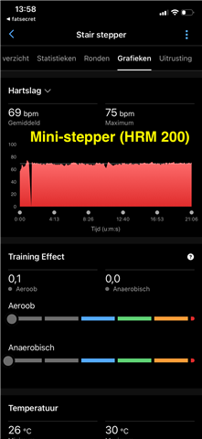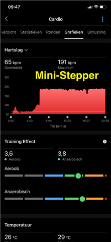 - Mini-Stepper: 20' workout. Here too my HR would be around 70 BPM. The sudden jump at around 6' is completely unrealistic.