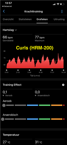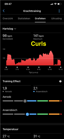 - Curls: modest 15' workout with 2 x 2kg dumbbells. My real HR was around 60-70 BPM throughout. The irregularity in the HR graph is crazy.