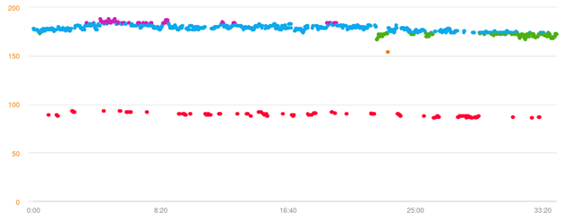 Since approx. three weeks ago I noticed sudden drops in cadence on my base runs and long tempo runs. I always keep steady cadence, run without stoplights and walking, have been working on 175-180 spm for quite some time. Nowadays my runs look like this: