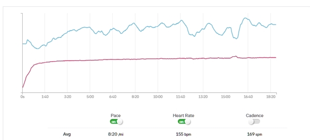 • Tonight I had to wait for a treadmill. Normally I do a treadmill run followed by time on a stair stepper. I never see the steep HR jump on the Stair Climber and I wasn't sure if it was because it had a slower HR ramp and slightly lower avg HR or if it was because it was the 2nd exercise. While I was waiting I did some minor time on an Elliptical, 10 minutes maybe, only took the HR to just over 100 and the average would be less. The treadmill freed up, I did a short tempo run of 2.25, started at a harder than average pace and look Ma, no vertical step.