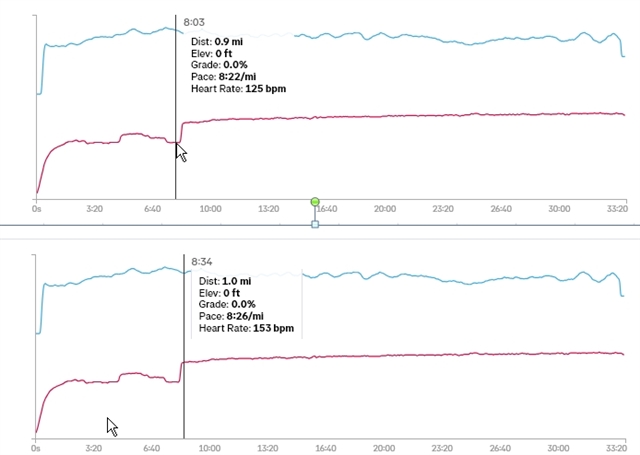 • Here's tonight's bit of joy; on a 4 mile indoor treadmill run at a steady pace the Garmin Optical HR reading jumps by 28 BPM in under 30 seconds at 8:30 into the run . Meh, what filtering problem?!