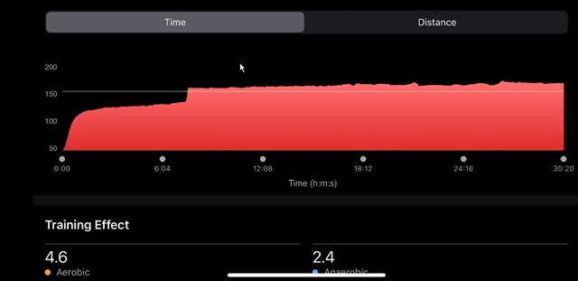 •   That's the one! Except mine happens around 8 minutes instead of 16. If I skip the treadmill run and go right to the stair climber which has a slower up build in HR intensity, I don't normally see the vertical shift. If I had to guess Garmin has seen or gotten complaints about sporadic readings from the Optical HR and they filtered the sensor heavily to try and get rid of the transients with the vertical cliff as an unintended consequence.
