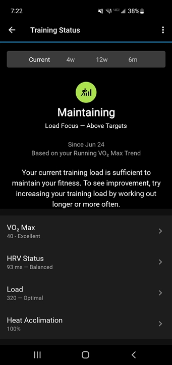 If I look at Training Status I get "Your current training load is sufficient to maintain your fitness. To see improvement, try increasing your training load by working out longer or more often."