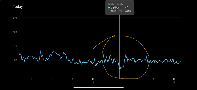 Hi guys, I've got a reading today of an HR at 39 BMP, possibly when walking or sitting after a walk. My RHR is 51 now, but I never hit that value during the day. I freaked out with this, but assumed was a reading artifact. Later in the afternoon today, while doing some weight training, the same happened, a sudden drop of the HR without any explanation. I didn't feel any physical sign of exertion or that something was wrong. Is this related to the bug in version 17.26? I'm using a Forerunner 965 with this version. I'm leaving the screenshots below.