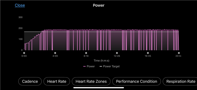 965 seems to be dropping out, trainer is the jet black victory, see chart, this was a steady workout at 185w on erg mode, any thoughts, or do Garmin just want me to get on with it and purchase the 970️