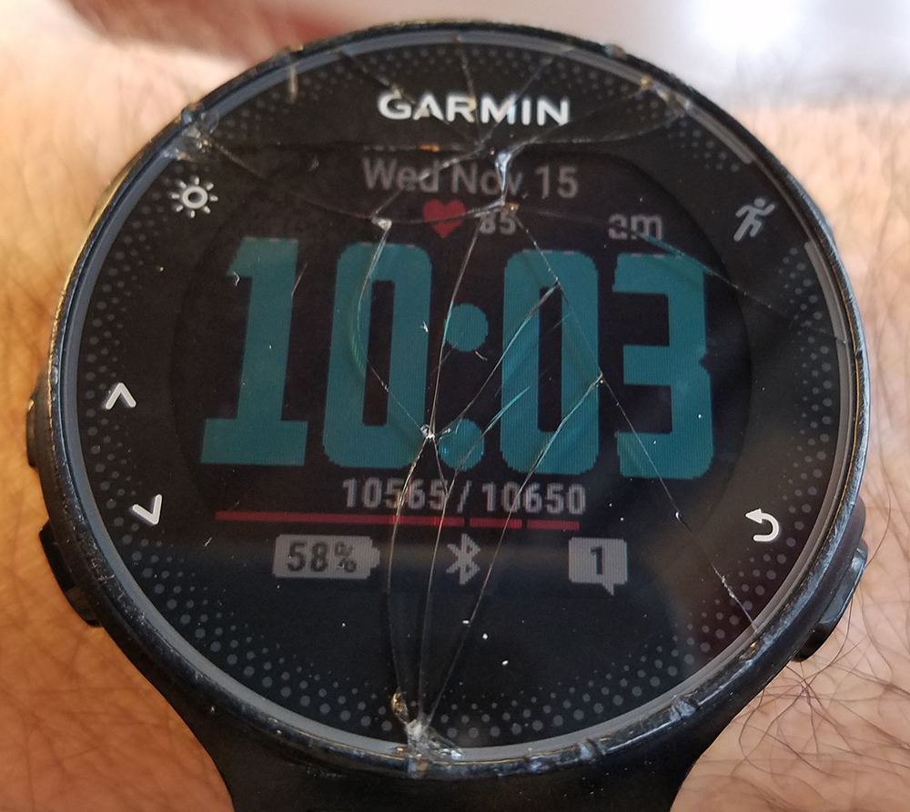 Ok, so it doesn't actually tick but I'm impressed with the product quality. Earlier this week I tripped while running and smacked my Forerunner 235 on concrete. The crystal broke -- see attached photo -- but it continues to work flawlessly.