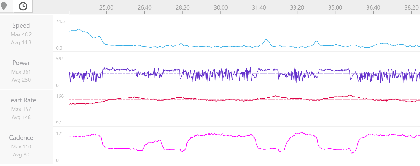 When cadence is down to 50-60 rpm the readings seem smooth and easy to relate to.